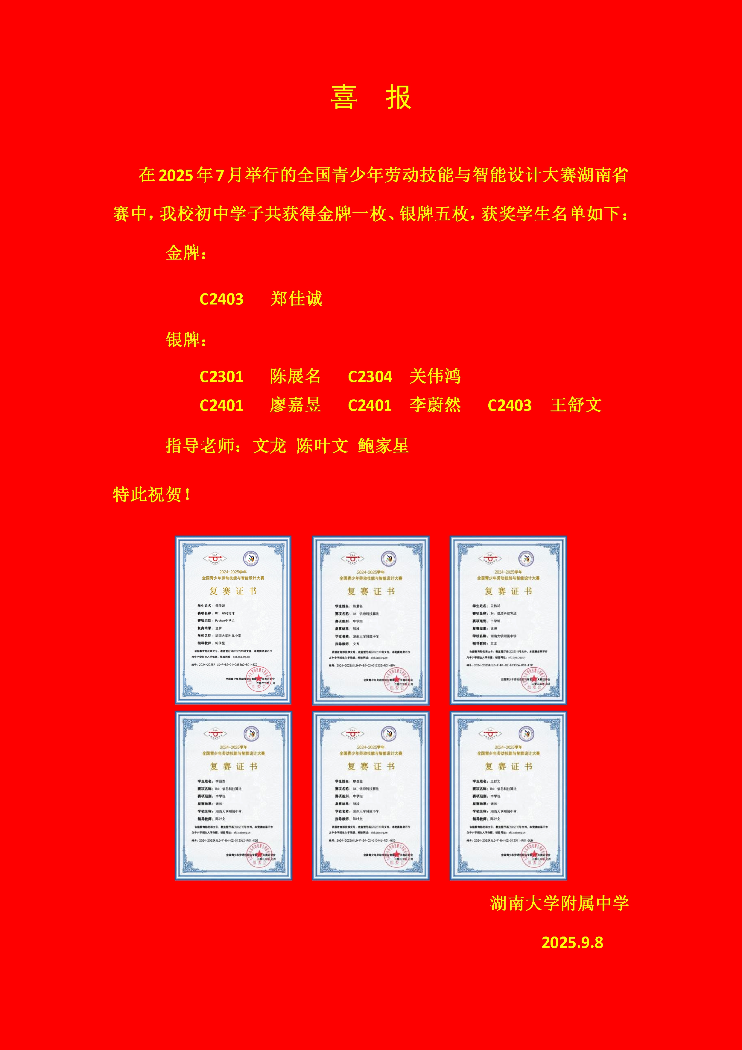 全国青少年劳动技能与智能设计大赛湖南省复赛喜报